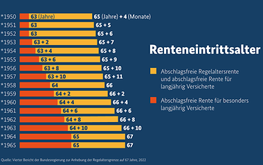 Wer vor 1949 geboren wurde, kann die Rente für langjährig Versicherte regulär mit 65 Jahren beziehen. Der Bezug mit 63 Jahren verursacht einen Abschlag von 7,2 %. Für die Jahrgänge von 1949 bis 1963 erhöht sich das Renteneintrittsalter schrittweise. Ab dem Jahrgang 1964 liegt es bei 67 Jahren. Auch für langjährig Versicherte ist es möglich, die Rente bereits mit 63 zu beziehen. Der Abschlag beträgt 14,4 %.