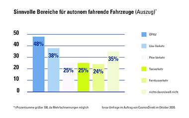 Darüber hinaus hielt mehr als ein Drittel (38 Prozent) selbstfahrende Fahrzeuge auch im Lkw-Verkehr für sinnvoll und rund ein Viertel könnte sich einen Einsatz im Pkw- und Taxi-Verkehr (25 Prozent) oder Fernbus-Verkehr (24 Prozent) vorstellen.