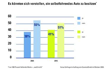 - 38 Prozent der Menschen in Deutschland können sich derzeit vorstellen, ein selbstfahrendes Auto zu besitzen. Die Mehrheit (55 Prozent) steht dieser Entwicklung noch eher skeptisch gegenüber.