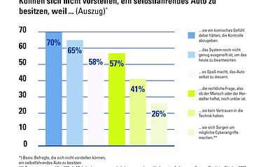 Diejenigen, die sich nicht vorstellen können, ein selbstfahrendes Auto zu besitzen, begründen dies vor allem damit, dass es sich komisch anfühlen würde, die Kontrolle abzugeben (70 Prozent). Oder sie empfinden das System aktuell als noch nicht ausgereift genug, um die Frage heute beantworten zu können (65 Prozent). 58 Prozent der Umfrageteilnehmer haben Spaß daran, selbst das Fahrzeug zu lenken, während 57 Prozent ihre Ablehnung mit der unklaren rechtlichen Frage der Haftung begründen. 41 Prozent fehlt das Vertrauen in die Technik und ein Viertel der Befragten (26 Prozent) fürchten sich vor dem Verlust der Kontrolle durch mögliche Cyberangriffen.