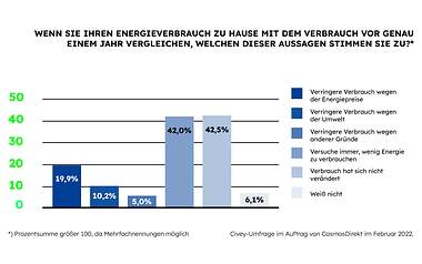 Saarbrücken – Derzeit gehen die Energiepreise regelrecht durch die Decke und werden sich in diesem Jahr mit großer Wahrscheinlichkeit bei vielen Bundesbürgern im Geldbeutel bemerkbar machen. Für die Mehrheit der Verbraucher ist das allerdings kein Grund, im Vergleich zum Februar 2021 Energie zu sparen. So verringert aktuell aufgrund der gestiegenen Energiepreise nur jeder fünfte Bundesbürger (19,9 Prozent) den Verbrauch im eigenen Zuhause, um Energie einzusparen. Das ergab eine aktuelle Civey-Umfrage1 im Auftrag von CosmosDirekt, dem Direktversicherer der Generali in Deutschland. Weiterhin gaben nur 10,2 Prozent der Befragten an, der Umwelt zuliebe mehr Energie als zum Vergleichszeitraum einzusparen und bei 42,5 Prozent hat sich der Verbrauch zum Vorjahr überhaupt nicht verändert. Allerdings: 42 Prozent der Umfrageteilnehmer versuchen auch, grundsätzlich wenig Energie zu verbrauchen.