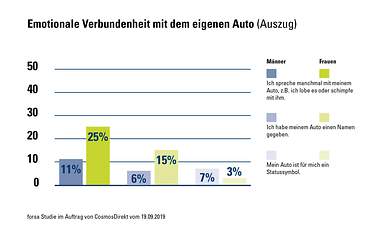 Saarbrücken – Obwohl die Entscheidung zum Kauf eines bestimmten Autos vor allem rational geprägt ist, wird die Beziehung zum eigenen Fahrzeug nach dem Kauf persönlicher und emotionaler. Laut der aktuellen forsa Studie1 „Einstellungen zum eigenen Auto“ im Auftrag von CosmosDirekt, dem Direktversicherer der Generali in Deutschland, trifft das vor allem auf Autofahrerinnen zu. Demnach geben 25 Prozent der befragten Frauen an, manchmal mit ihrem Auto zu sprechen, und 15 Prozent haben ihrem Wagen sogar einen Namen gegeben. Beide Zahlen sind mehr als doppelt so hoch wie der Vergleichswert bei den Männern. Das heißt aber nicht, dass männliche Autofahrer ihrem Fahrzeug gegenüber rein rational eingestellt sind – die Gefühle gehen nur in eine andere Richtung: Sieben Prozent der männlichen Umfrageteilnehmer sehen ihr Auto als Statussymbol. Auf Frauen trifft dies nur mit drei Prozent zu.