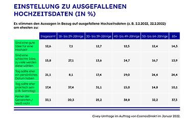 Saarbrücken – Der schönste Tag im Leben und der Tag der eigenen Hochzeit fallen laut einer Redensart in der Regel zusammen. Ein wichtiges Datum also, das ebenso wie Ehepartner, Brautkleid und Location wohl gewählt sein will. Da liegt es nahe, den besonderen Status dieses Tages durch die Wahl eines ausgefallenen Schnapszahldatums wie beispielsweise den 22.2.2022 oder den 2.2.2022 hervorzuheben. Doch vor allem junge Menschen im heiratsfähigen Alter sehen das anders. Das ergab eine aktuelle Civey-Umfrage1 im Auftrag von CosmosDirekt, dem Direktversicherer der Generali in Deutschland. So sind 37,4 Prozent der 18- bis 29-Jährigen der Meinung, dass bei der Wahl des Hochzeitsdatums vor allem praktische Gründe im Vordergrund stehen sollten. Ein solcher Grund könnte beispielsweise sein, dass die Trauung an einem Samstag stattfindet, damit alle Gäste teilnehmen können. Lediglich 7,1 Prozent der Umfrageteilnehmer in dieser Altersgruppe empfinden ein ausgefallenes Hochzeitsdatum als eine gute Idee. Anders sieht es bei der Altersgruppe der 50- bis 64-Jährigen aus. Unter diesen befürworten immerhin 12,4 Prozent ein Schnapszahldatum für den Tag der Eheschließung. Stehen für jüngere Menschen praktische Gründe bei der Datumswahl im Vordergrund, sind es für ältere sentimentale Gründe, wie beispielsweise der Tag des Kennenlernens. So tendiert knapp ein Viertel (24,4 Prozent) der 50- bis 64-Jährigen zu einem Datum, das für das Paar eine persönliche Bedeutung hat.