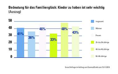 Bevölkerungsrepräsentative Umfrage „Familienglück“ des Meinungsforschungsinstituts forsa im Auftrag von CosmosDirekt, dem Direktversicherer der Generali in Deutschland. Im November 2019 wurden 1.001 nach systematischen Zufallsverfahren ausgewählte Personen im Alter zwischen 25 und 60 Jahren befragt.