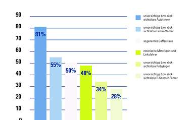 Insgesamt fühlen sich Frauen im Straßenverkehr häufiger gestört als Männer: Für Frauen sind v. a. unvorsichtige bzw. rücksichtslose Autofahrer (85 Prozent vs. 76 Prozent) und Fahrradfahrer (60 Prozent vs. 51 Prozent) ein Problem, während sich Männer häufiger an notorischen Mittelspur- und Linksfahrern (53 Prozent vs. 44 Prozent) stören. Zudem fühlen sich ältere Verkehrsteilnehmer stärker gestört als jüngere: 84 Prozent der Gruppe 60 plus stört sich an anderen Autofahrern, die nur 77 Prozent der 18- bis 29-Jährigen aus der Ruhe bringen. Unvorsichtige bzw. rücksichtslose Fahrradfahrer finden 60 Prozent der Senioren störend, während nur jeder zweite 18- bis 29-Jährige (50 Prozent) so empfindet.