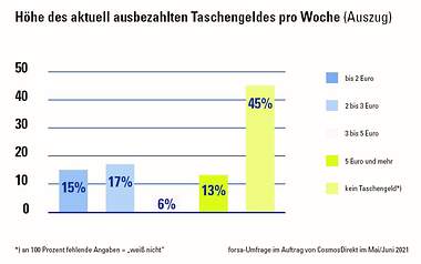Bevölkerungsrepräsentative Umfrage „Taschengeld“ des Meinungsforschungsinstituts forsa im Auftrag von CosmosDirekt, dem Direktversicherer der Generali in Deutschland. Im Mai und Juni 2021 wurden in Deutschland 500 Eltern von Kindern zwischen sechs und neun Jahren befragt.
