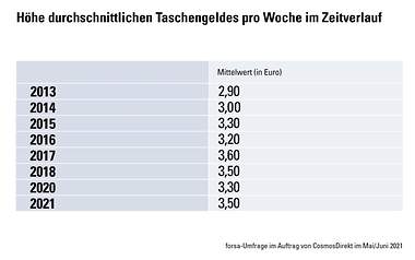 - Kinder zwischen sechs und neun Jahren bekommen in diesem Jahr durchschnittlich 3,50 Euro Taschengeld pro Woche und erreichen – nach 3,30 Euro im Vorjahr – damit wieder das Niveau von 2018.