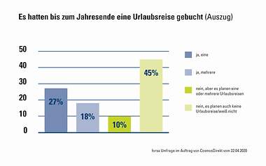 Bevölkerungsrepräsentative Umfrage „Urlaubsreisen in der Corona-Krise“ des Meinungsforschungsinstituts forsa im Auftrag von CosmosDirekt, dem Direktversicherer der Generali in Deutschland. Im April 2020 wurden 1.003 nach systematischen Zufallsverfahren ausgewählte Bürgerinnen und Bürger ab 18 Jahren in Deutschland befragt.