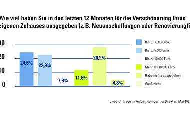 Fast ein Viertel der Umfrageteilnehmer (24,6 Prozent) gab insgesamt bis zu 1.000 Euro aus, ein weiteres Fünftel (22,9 Prozent) steckte bis zu 5.000 Euro in die Verschönerung der eigenen vier Wände. Für 7,9 Prozent der Befragten lag die Investitionsgrenze bei 10.000 Euro und für immerhin noch gut jeden Zehnten (11,6 Prozent) war ein schönes Zuhause mehr als 10.000 Euro wert.