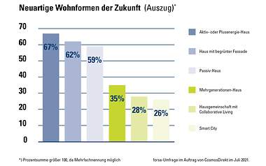 Mit 62 Prozent halten es fast genauso viele für möglich, dass sie in Zukunft einmal in einem Haus mit begrünter Fassade leben, was für ein positives Raumklima sorgt. Das Leben in einem Passivhaus, welches Energieverluste minimiert, können sich 59 Prozent vorstellen. Deutlich weniger, nämlich nur gut ein Drittel (35 Prozent), können sich vorstellen, in einem Mehrgenerationen-Haus zu leben. Für nur 28 Prozent ist das Leben in einer Hausgemeinschaft mit Collaborative Living, in der man sich zentrale Einrichtungen wie den Garten oder einen Waschsalon teilt, eine attraktive Wohnform für die Zukunft. Und schließlich sieht jeder Vierte (26 Prozent) seinen künftigen Lebensmittelpunkt in einer Smart City, in der viele öffentliche Bereiche stark vernetzt und digitalisiert sind.